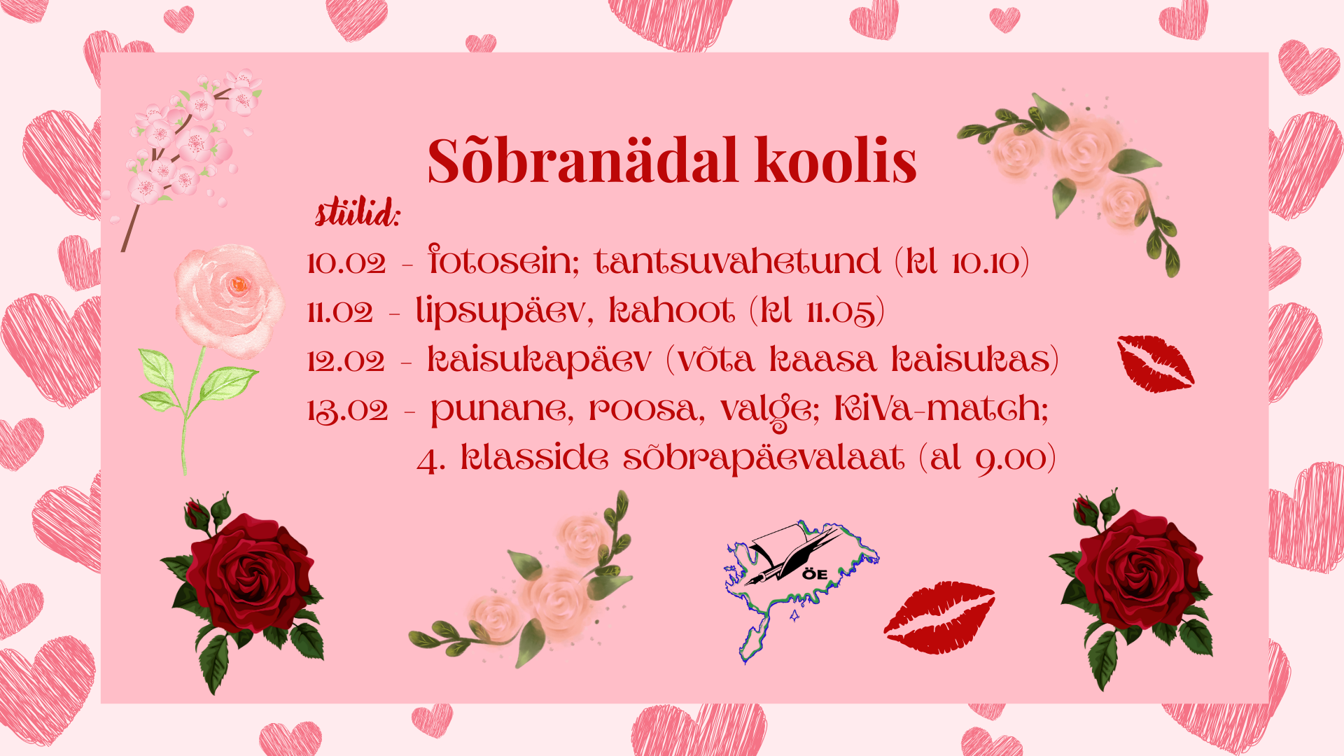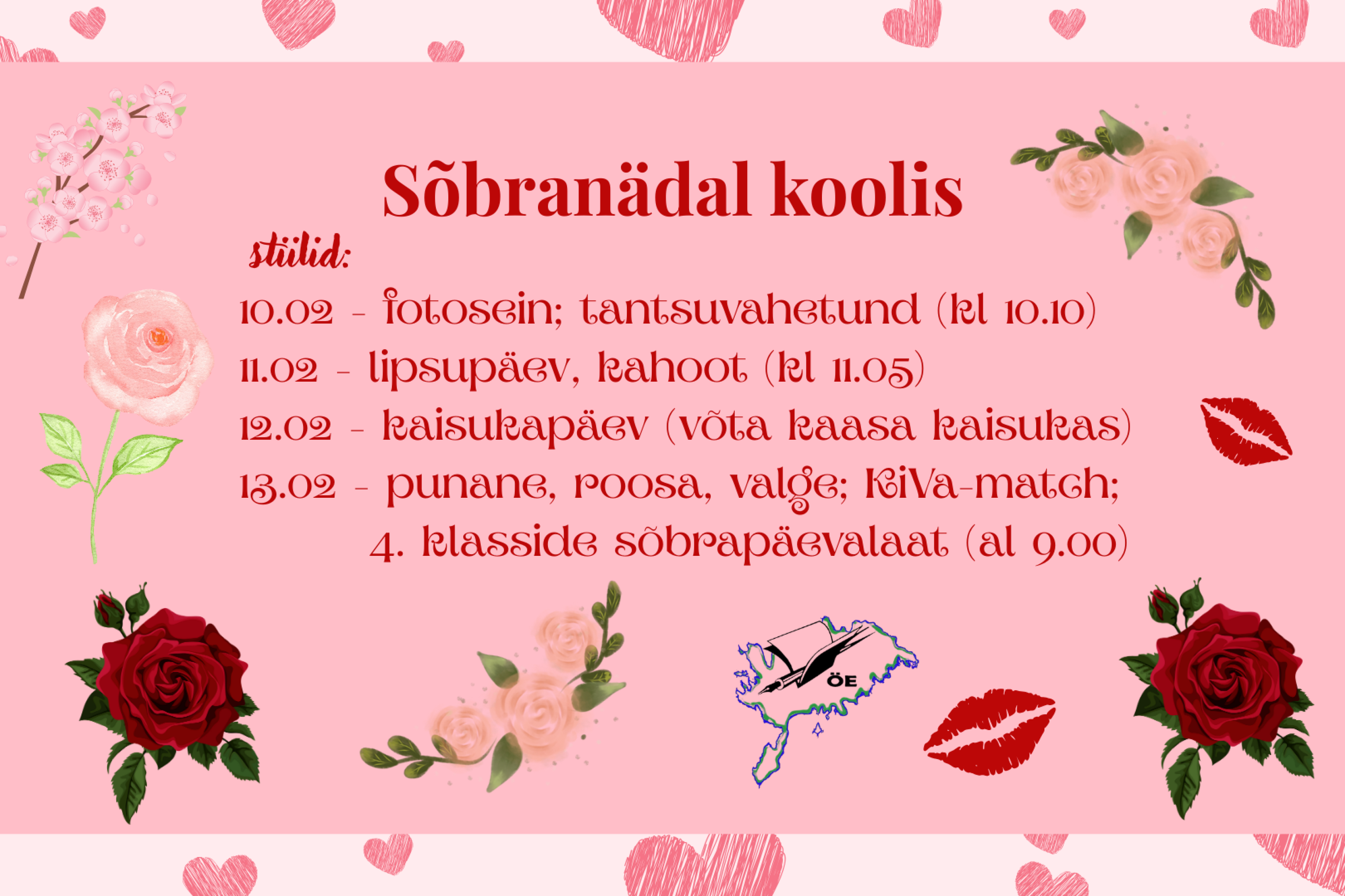 13.02 - punane, roosa, valge; KiVa-match; 4. klasside sõbrapäevalaat (al 9.00) - võta kaasa sularaha