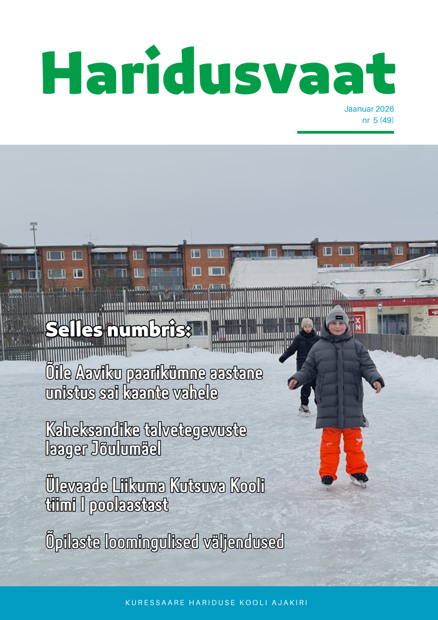 IV suusalaagri blogi Loomise kuupäev 28.01.2026 Autor Arti Allmägi Esimene koht maakonnas 1.-3. kl saalijalgpallis Loomise kuupäev 23.01.2026 Autor Merle Lepik Saare maakonna aasta spordiõps Kadri Koivil Loomise kuupäev 19.01.2026 Autor Arti Allmägi Ilmus Haridusvaat nr 4 (48) Loomise kuupäev 19.12.2025 Autor Merle Lepik Vaata rohkem