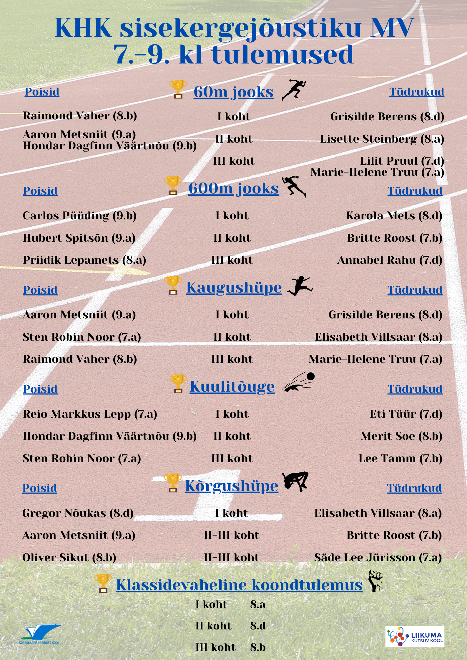 Kooli meistrid selgitatakse eraldi 5.–6. klasside ja 7.–9. klasside arvestuses.