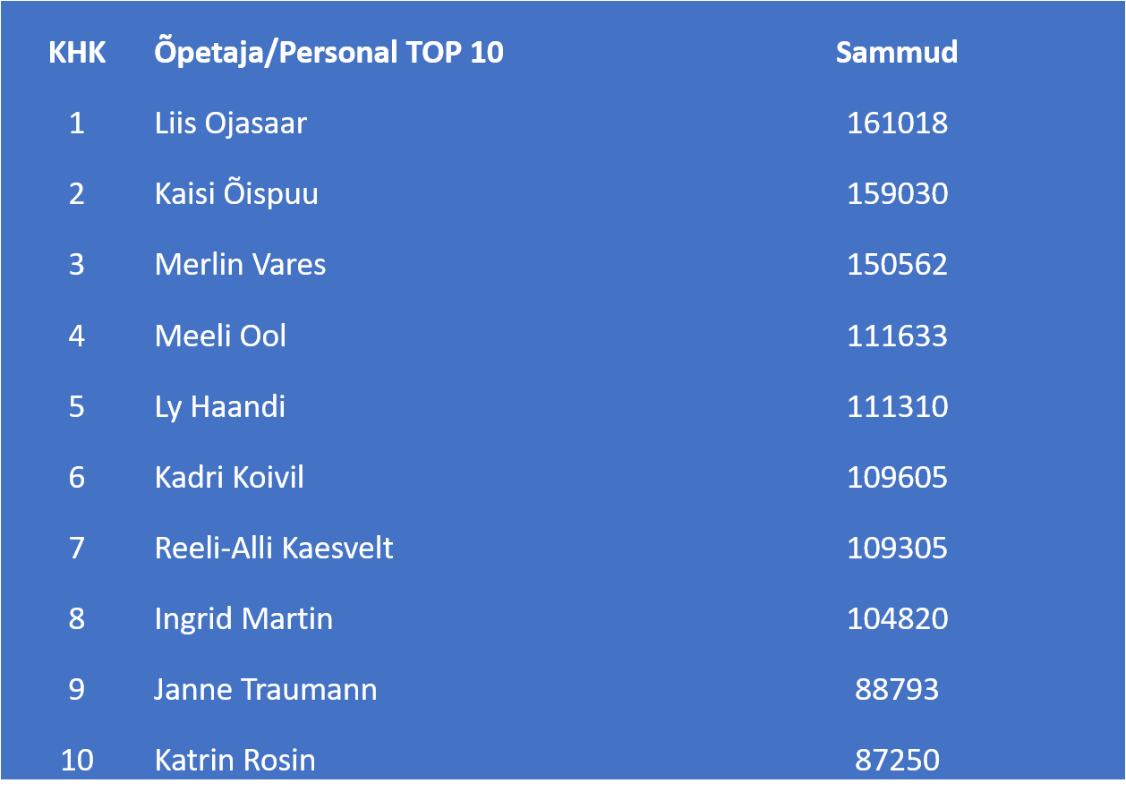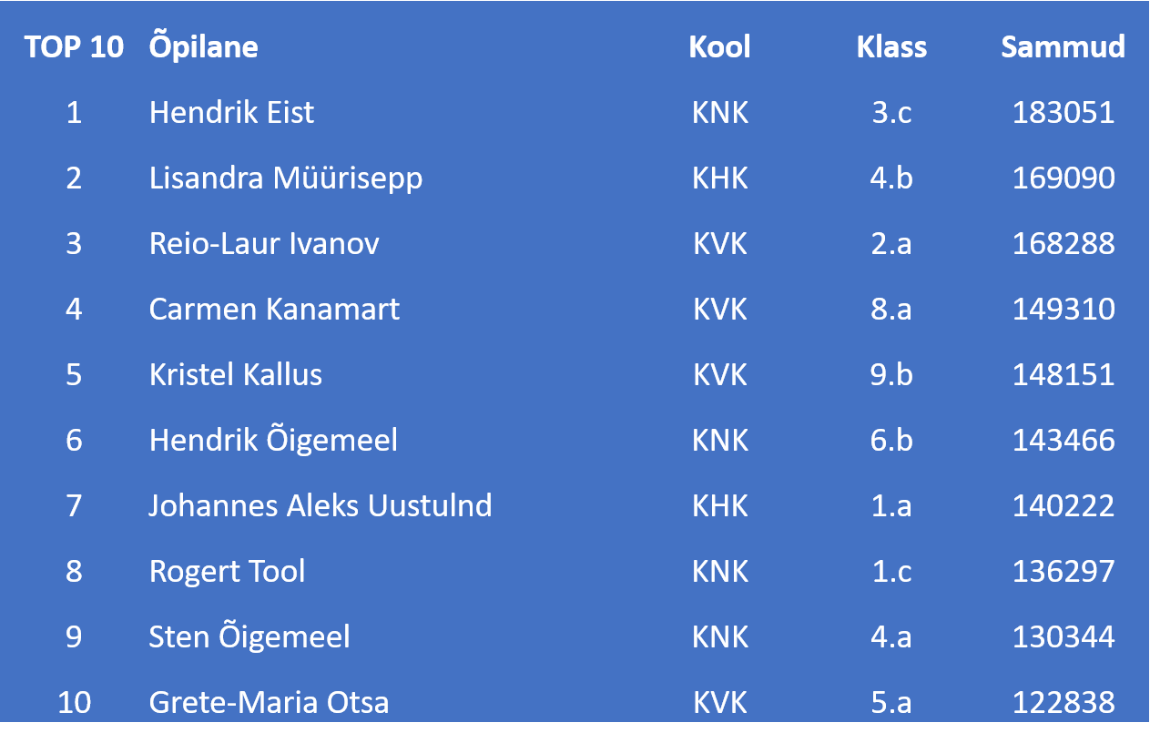 Sammuralli kolme kooli vahel on selleks korraks peetud. Osa võtsid Kuressaare Hariduse Kool, Kuressaare Nooruse Kool ja esimest korda ühines Kuressaare koolidevahelise väljakutsega Kuressaare Vanalinna Kool. Rõõm on teatada, et kõige rohkem samme kogus meie kool, suur tänu kõikidele panustajatele! Meie kooli parimad sammukogujad ja kolme kooli kokkuvõtted leiate juuresolevatest graafikutest. Iga kooli parimale õpilasele on Grand Rose SPA Hotellink opens on new page välja pannud spa-pääsme kahele ja parimale õpetajale 3-käigulise õhtusöögi Grand Rose Spa Hotelli restoranis. Palju õnne!